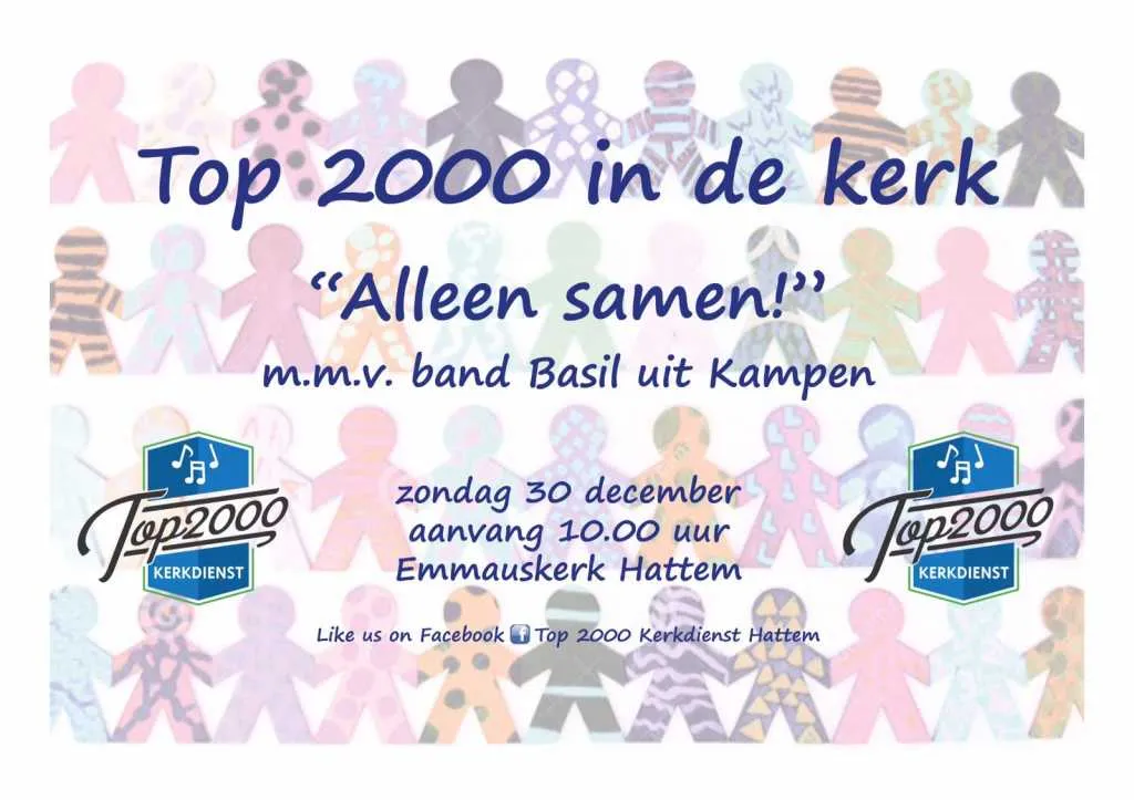 In Hattem wordt opnieuw een Top 2000-dienst gehouden. Dit keer op zondag 30 december met als thema ‘Alleen samen’ in de Emmaüskerk van de Protestantse Gemeente in Hattem. Wie er vaker bij was komt ook een goede oude bekende tegen, namelijk de band Basil uit Kampen, die de dienst muzikaal begeleidt.
