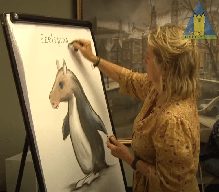 Op 1 april is de expositie Het Atelier geopend in het Anton Pieck Museum in Hattem. Daar staan de prachtige originele tekeningen van kinderboeken illustrator Jenny Bakker centraal. De tekeningen komen uit het nieuwe prentenboek Van Bigkikker tot Neushoornvogel, waarvan Marlies Verhelst de auteur is. Beiden waren aanwezig bij de opening en illustrator Jenny maakte daar ter plekke illustraties van combinatiedieren die eerder waren opgegeven door kinderen uit Hattem. Gerhard van der Worp van RTV Hattem was erbij en legde de opening van deze mooie tentoonstelling vast.