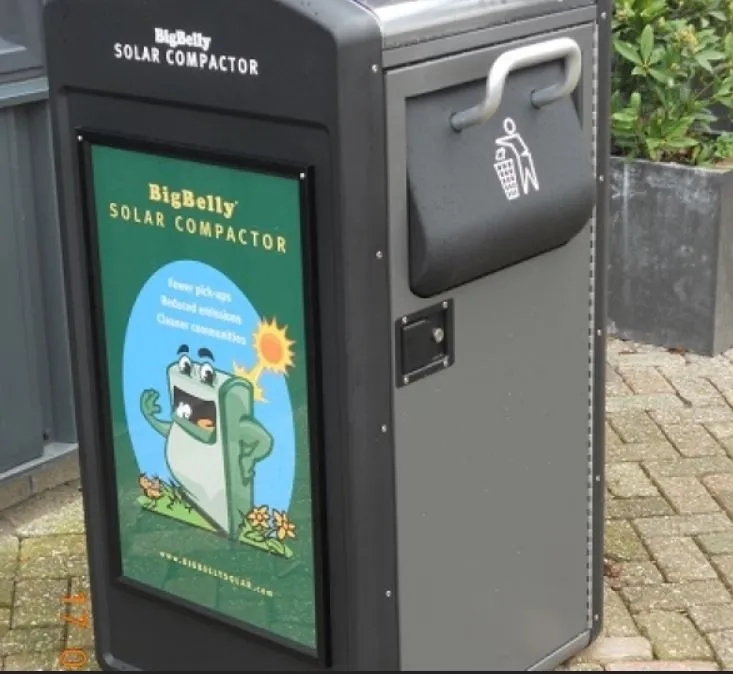 De BigBelly is een afvalbak die 600 liter afval kan samenpersen tot 120 liter. Dit gebeurt door een ingebouwde pers die op zonne-energie werkt. Zodra de Big Belly voor 80% vol zit, geeft hij een seintje dat-ie geleegd wil worden.
