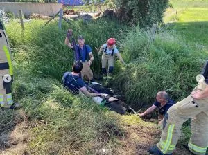 Vanmorgen heeft de brandweer Hattem, samen met collega’s uit Hasselt, een 18-jarige koe gered aan de Geldersedijk te Hattem. Het dier was door onbekende oorzaak in de diepe greppel terecht te komen.