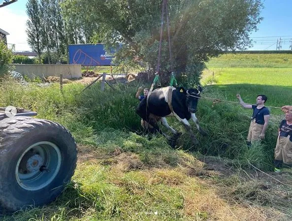 Bij de reddingsactie is gebruik gemaakt van een kraan. Na enige voorbereiding lukte het om de koe uit de greppel omhoog te takelen waarna het dier weer op haar eigen poten werd gezet.