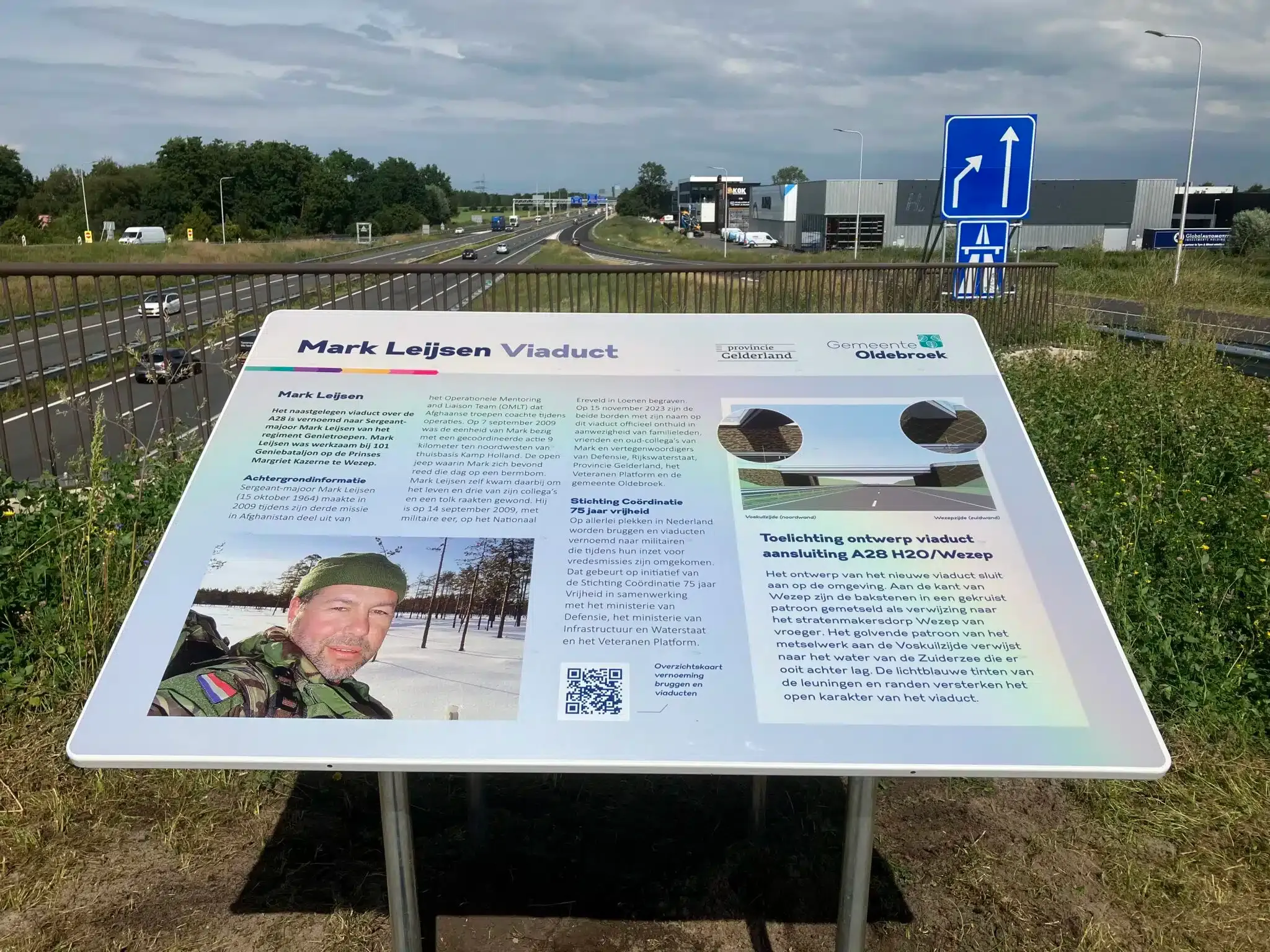 Naast het nieuwe viaduct over de A28 in Wezep is maandag 12 augustus een bord onthuld met informatie over de naam en het ontwerp van deze overbrugging. Het viaduct is vernoemd naar sergeant-majoor Mark Leijsen die in 2009 om het leven kwam tijdens een vredesmissie in Afghanistan.