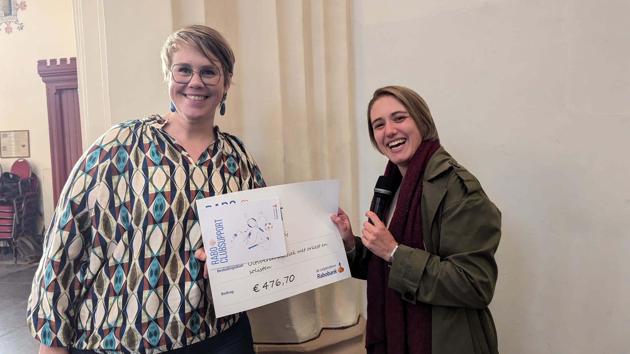 De dag begon goed voor de Andreascantorij. Nog voor de eerste noten klonken, kon een bestuurslid van de Rabo ledenraad een cheque van ruim 450 euro overhandigen aan Suzan Rouwenhorst die namens het bestuur van het koor het bedrag in ontvangst nam.