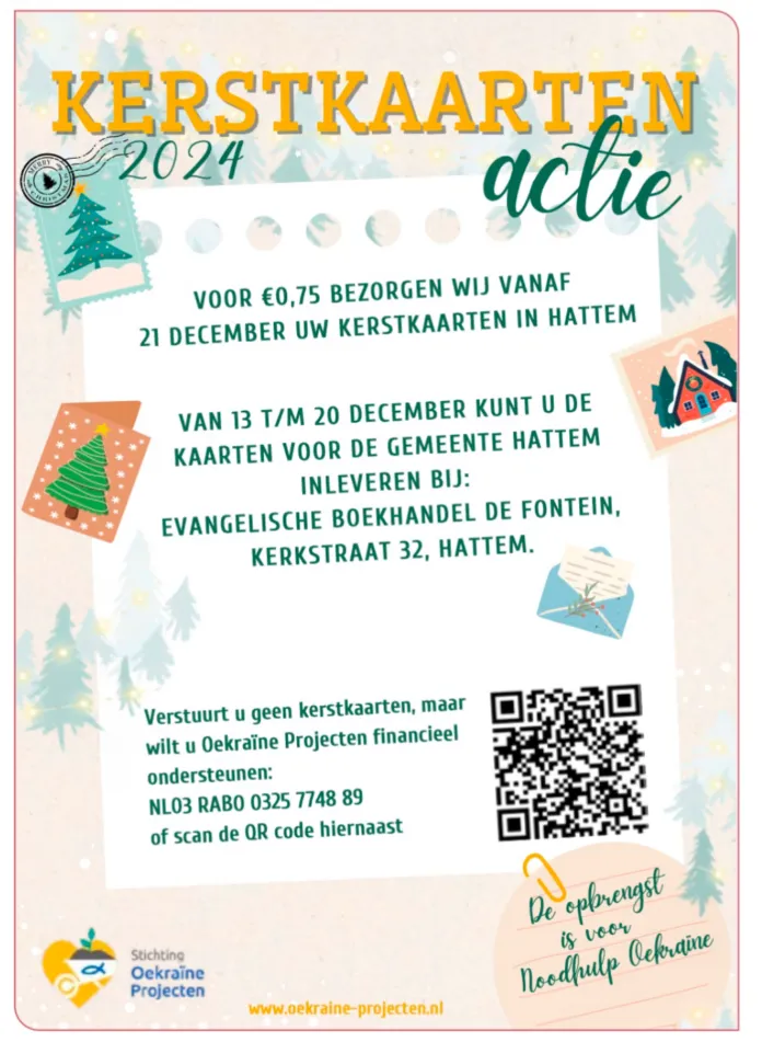 De Stichting Oekraïne projecten en boekhandel De Fontein hebben de handen ineen geslagen. Voor 0,75 euro worden kerstkaarten bestemd voor Hattemers bezorgd. Van 13 t/m 20 december kunnen de kaarten ingeleverd worden bij De Fontein, Kerkstraat 32. Vanaf 21 december start de bezorging binnen de stadsgrenzen van Hattem.