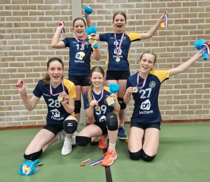 Zaterdag 12 april was de laatste wedstrijd van de jeugdcompetitie. Team CMV N4 speelde in Twello en CMV N6 in Mariënheem. Deze twee meidenteams van de Hattemer Volleybalvereniging (HVV) sluiten het volleybalseizoen af met winst. Ze zijn kampioen geworden in de leeftijdklasse 9-10 jaar en 11-12 jaar. Bij de eerste plek hoort natuurlijk en medaille! Een mooi aandenken aan wedstrijden waar deze teams een goede prestatie hebben neergezet.