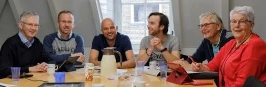 Foto: De onderhandelingstafel met Auke Schipper en Arend Palland van de ChristenUnie, Teun Juk en Martijn Hospers namens het CDA en Carla Broekhuis en Geert Winkel van de PvdA.