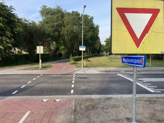 Het fietspad Roseboomspoor kruist de Hessenweg op een wel heel bijzondere manier. Aan de ene zijde van de Hessenweg zitten haaientanden in het wegdek van het fietspad, maar aan de andere kant van het fietspad ontbreken deze. De vraag is nu hoe de voorrang op dit punt is geregeld? De Hessenweg is nu een 30-km-zone en dat betekent dat verkeer van rechts voorrang heeft. Of is deze kruising een uitzondering hierop?