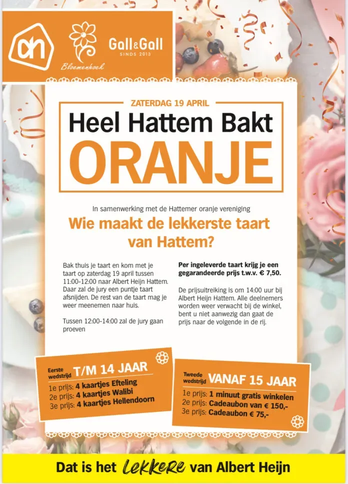 Op zaterdag 19 april geniet de Heel Hattem Bakt-jury tussen 12.00-14.00 uur van een bijzondere lunch. Ze gaan alle taarten die thuis gebakken zijn, proeven. De thuisbaksels kunnen tussen 10.00-11.00 uur bij Albert Heijn ingeleverd worden.