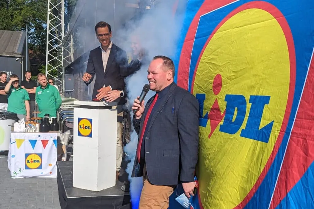Wethouder Koen Castelein kan om negen uur eindelijk de rode knop indrukken. Maar niet voordat hij aangeeft dat met de komst van deze derde supermarkt een lang gekoesterde wens van veel Hattemers, met name uit deze buurt in vervulling is gegaan. Ook toont hij zich verheugd over de aandacht die de LIDL geeft aan de milieuaspecten.