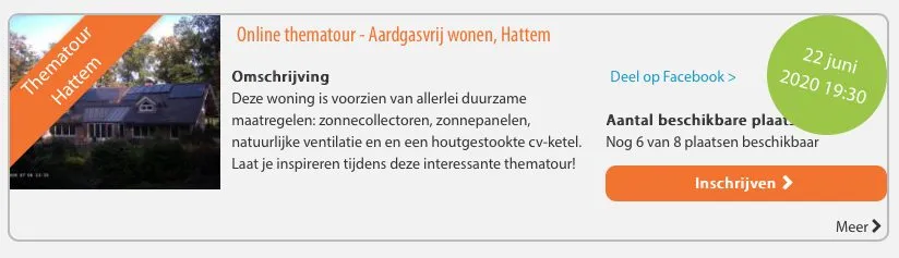 In de maand juni vinden in heel Nederland online thematours plaats. Deze zijn een alternatief voor de reguliere thematours, waarbij mensen op bezoek gaan bij een duurzame woning. Via videoverbinding geven huiseigenaren een presentatie over de duurzame maatregelen. De bezoekers krijgen de kans om in gesprek te gaan met de huiseigenaar, en om zo tot een plan te komen voor hun eigen woning. Per online thematour zijn acht plekken beschikbaar. Een actueel overzicht van alle thematours is te vinden via www.duurzamehuizenroute.nl/thematours. Hier kunnen geïnteresseerden zich ook inschrijven. Na inschrijving ontvangen deelnemers een e-mail met uitleg over de deelname.