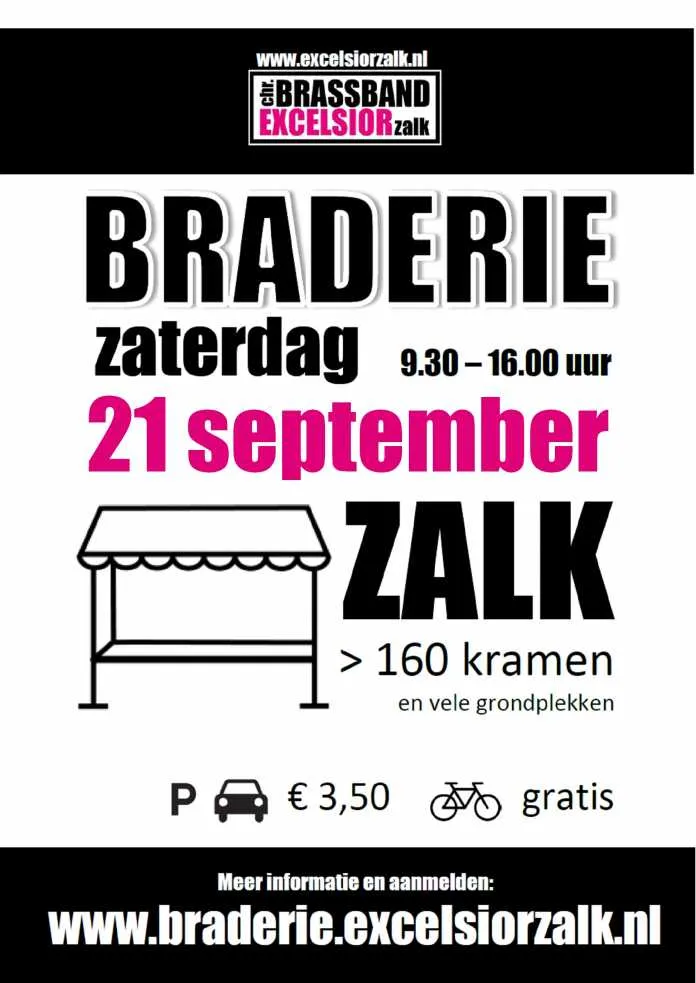 Het is is inmiddels een begrip in de regio. Duizenden mensen weten ieder jaar de braderie in Zalk te vinden. Er is voor ‘elck wat wils’: nieuwe en oude producten, streekproducten en er zijn voldoende eet- en drinkgelegenheden. De braderie start om 9.30 uur en eindigt rond 16.00 uur.