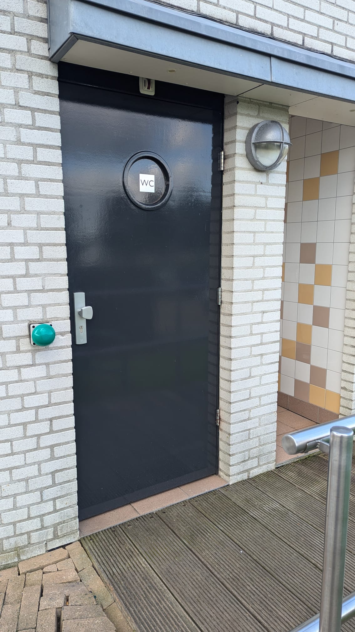 Drie van de resterende zeven centrumsecreten zijn in min of meer openbare gebouwen geplaatst: bij de jachthaven, in het stadhuis en in de Gasthuiskerk. Alleen de eerste is geopend, zo meldt de app. Bij ons bezoek ziet het er pico bello uit, alleen ontbreekt de HogeNoodsticker. Maar de groene knop om de deur te openen maakt dat meer dan goed.