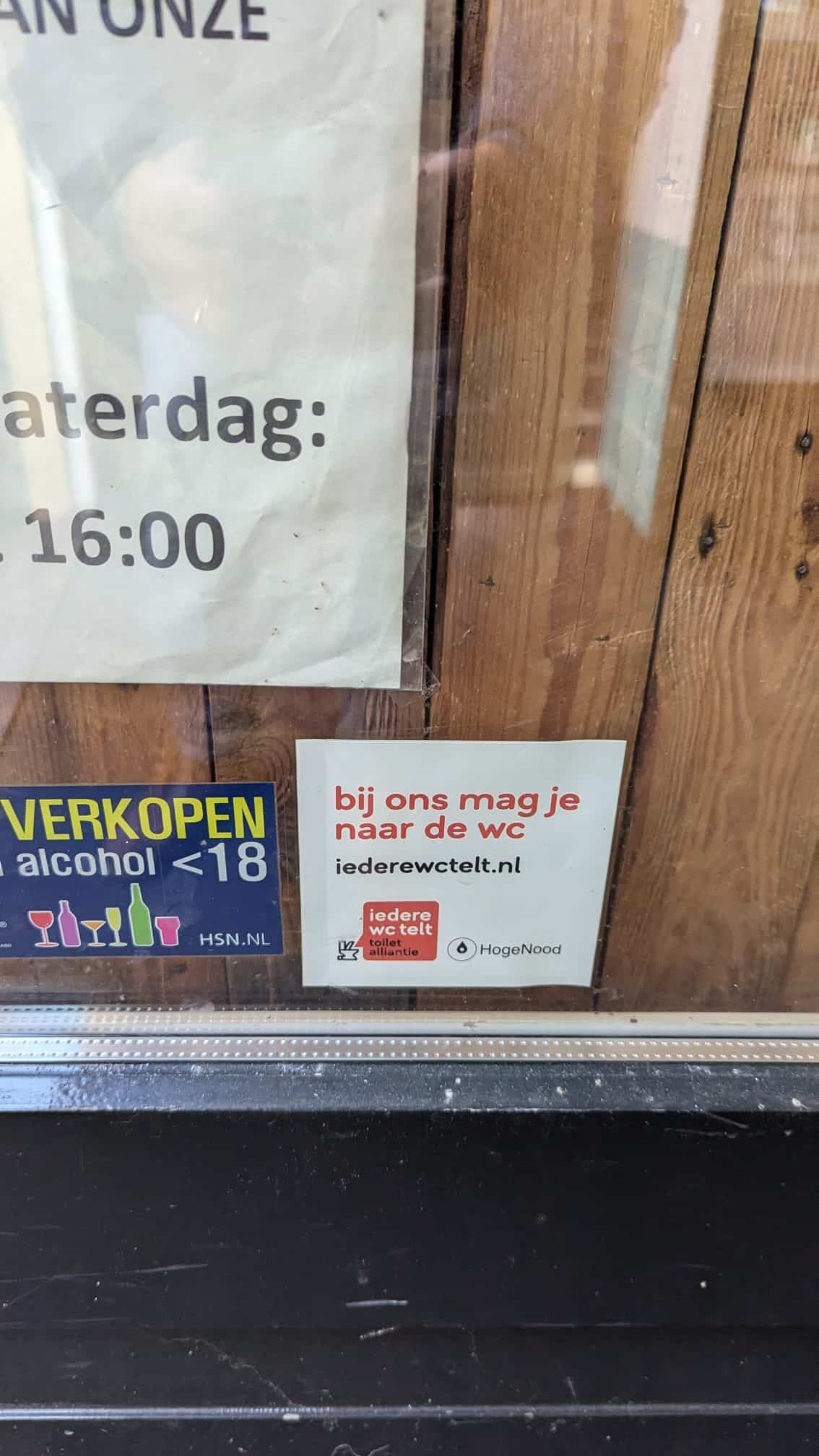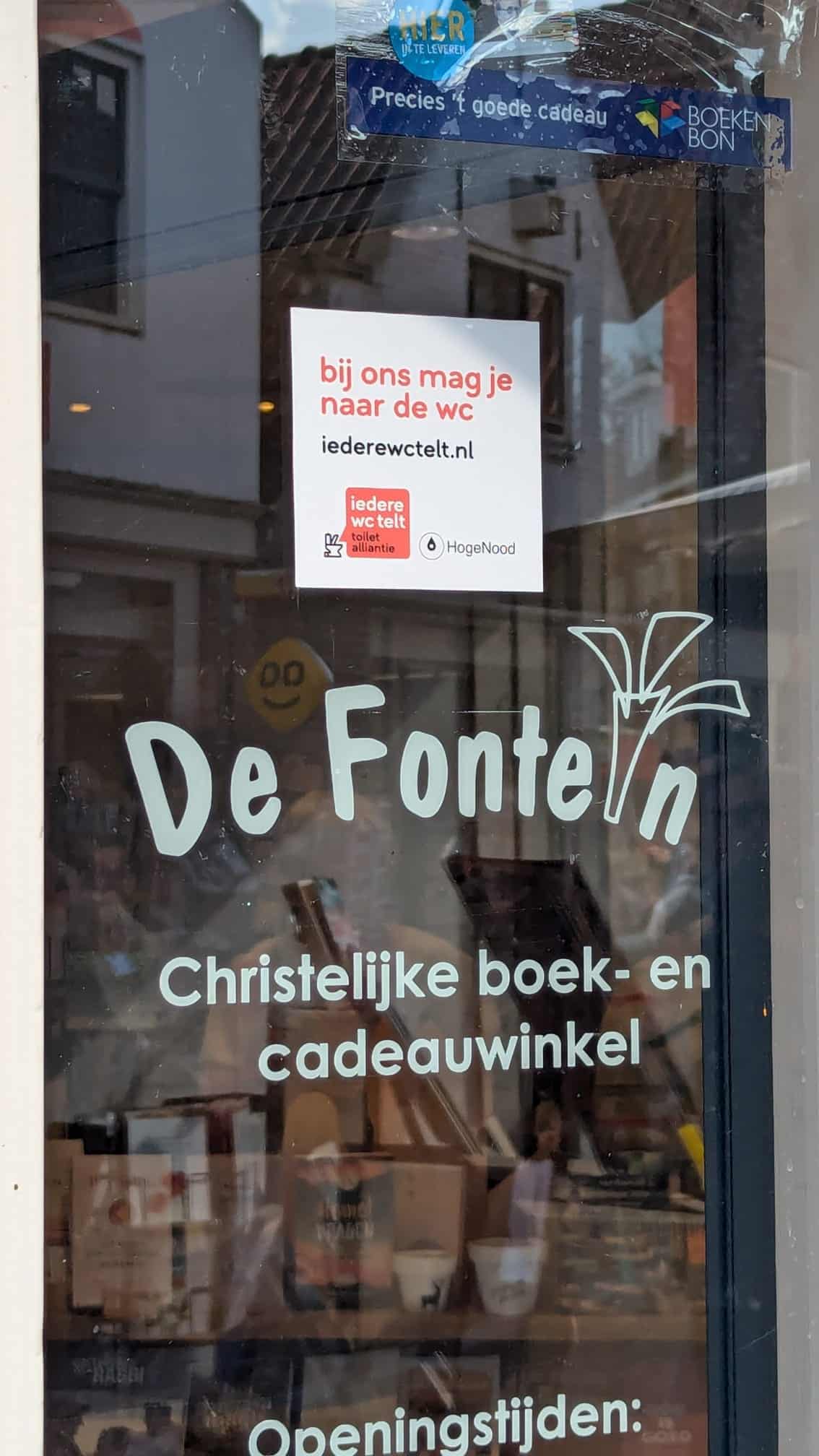 Alleen Christelijke boekhandel De Fontein getuigt helder en luid van de aanwezigheid van een gemak. De sticker prijkt duidelijk zichtbaar op de etalageruit, pal onder het Fonteinlogo en boven de openingstijden. En, zo weten we uit ervaring, soms levert de stoelgang daar ook nog een gratis kopje koffie of thee op.