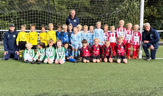 Onder begeleiding van de ervaren trainers Joop-Herman en Appie leren de kinderen de eerste kneepjes van het voetbalspel.