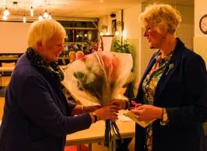 Nog in functie als voorzitter richtte Hanneke Jurriëns het woord tot Carla. Hanneke koos niet voor een betoog, maar liet Carla aan het woord door haar te onderwerpen aan een afscheidsinterview. Carla kreeg diverse vragen voorgelegd waarin ze kon terugblikken wat haar dreef om de politiek in te gaan, haar raadswerk met hoogte en dieptepunten en uit de periode van haar wethouderschap. Carla is tevreden over de ondersteuning die we bieden aan minima in Hattem, maar ook over het bereiken van beschutte werkplekken en uitbreiding van de “groenploeg” van de gemeente Hattem.