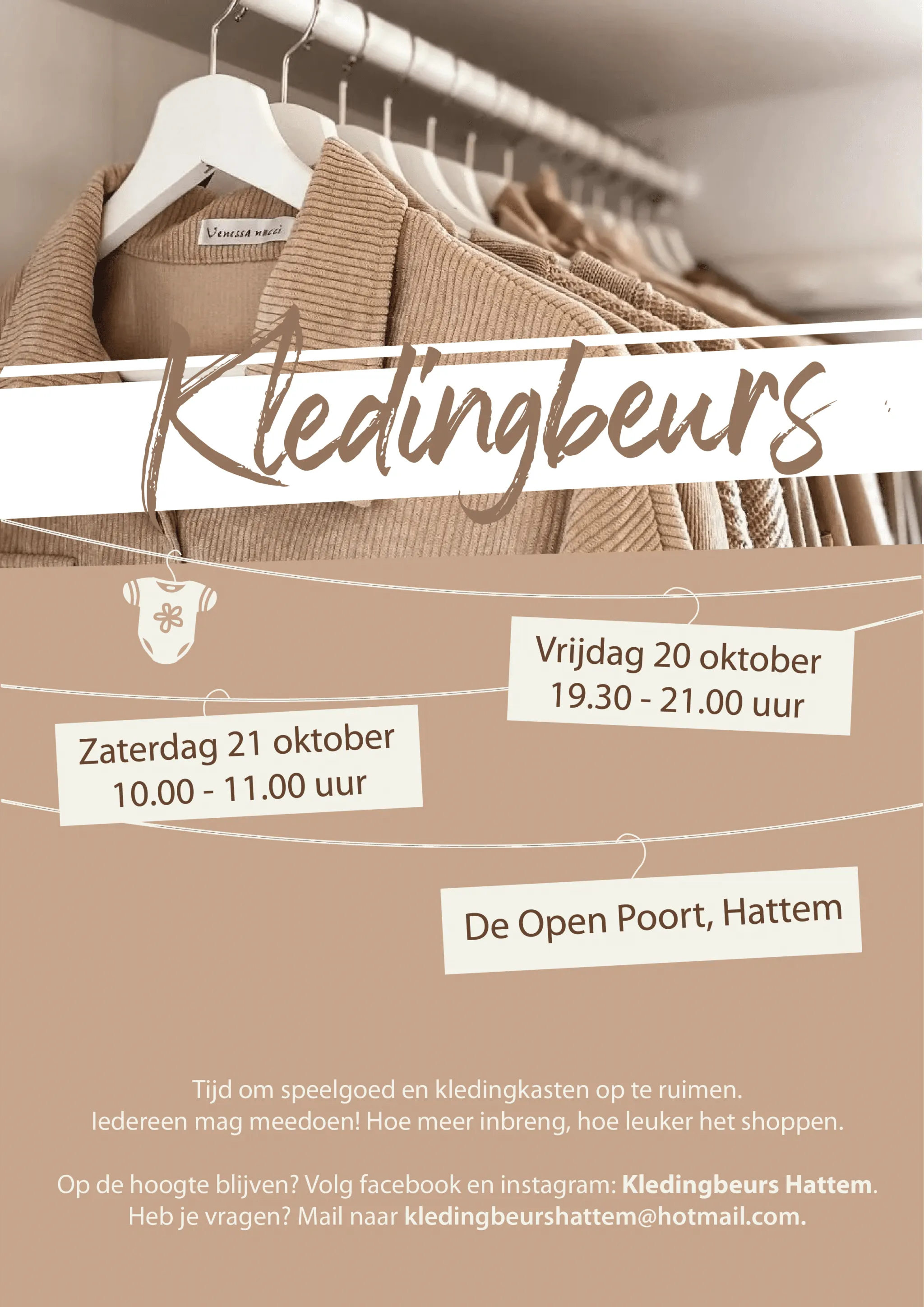 Op vrijdag 20 oktober van 19.30 – 21.00 uur en op zaterdag 21 oktober van 10.00 – 11.00 uur is er in De Open Poort weer een kledingbeurs. Hier is iedereen welkom en iedereen mag meedoen! Op de kledingbeurs wordt volwassenkleding, kinderkleding en speelgoed verkocht. Van het opgebrachte geld is 70% voor de verkoper, en 30% voor een goed doel.