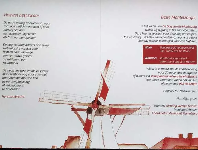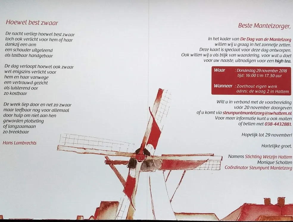 Om hen te laten zien en voelen hoe we dit waarderen, zijn de geregistreerde mantelzorgers in Hattem uitgenodigd voor een high tea op donderdag 29 november bij Zoethout Eigen Werk. Daarvoor hebben zij een uitnodiging ontvangen. Deze uitnodigingskaart is gemaakt met medewerking van beeldend kunstenaar Edith Koridon van De Dijkpoort en woordkunstenaar Hans Lambrechts.