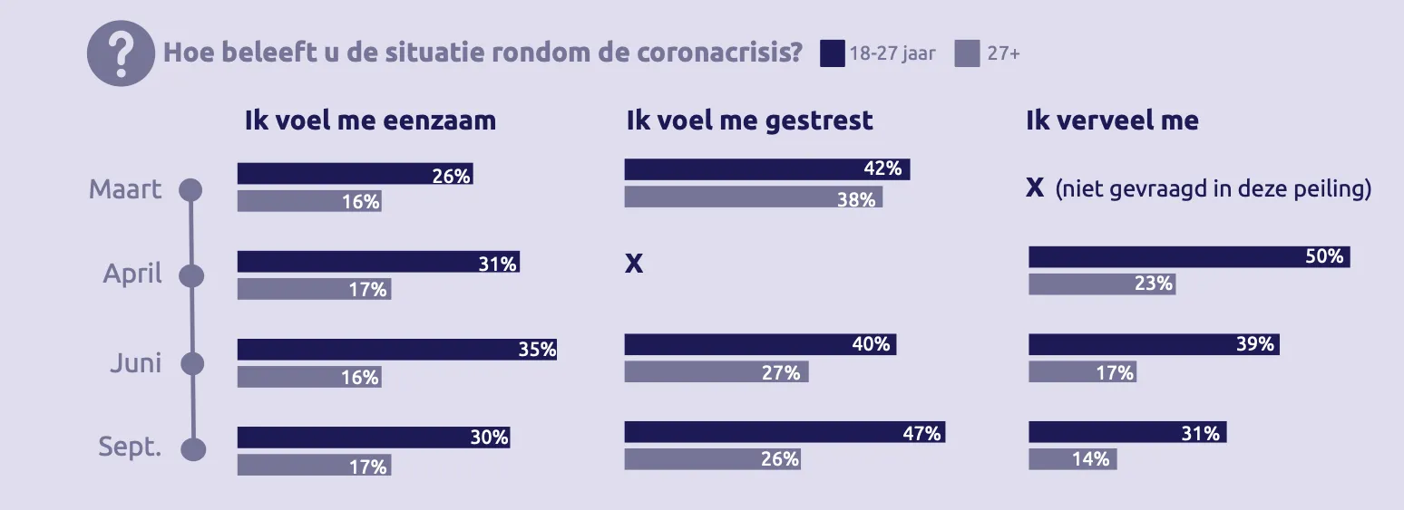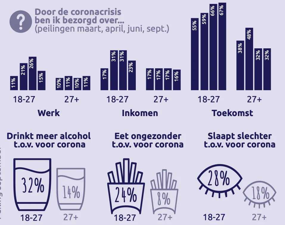 Studenten die nu in het afstudeerjaar zitten geven aan extra ondersteuning nodig te hebben omdat ze denken dat de arbeidsmarkt voor hun beroep aan het veranderen is door de coronacrisis. Door de maatregelen kan bovendien meer dan 40% van de jongeren minder of niet meer werken bij hun bijbaan, waardoor meer jongeren zijn gaan lenen bij DUO. Vooral de intensieve sociale contacten en verschillende laagdrempelige activiteiten werden door de jongeren gemist. Dit draagt bij aan een gevoel van eenzaamheid en verveling.