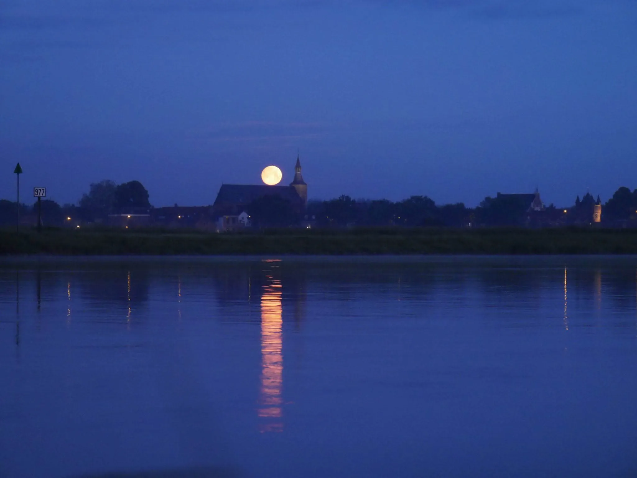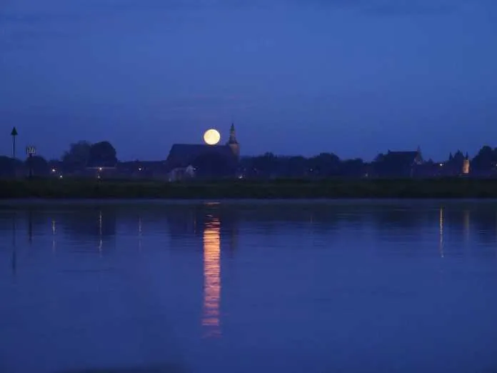 Vanmorgen maakte Wim Eikelboom deze foto van de ontwakende stad Hattem. De volle maan zakt weg achter de Andreaskerk.