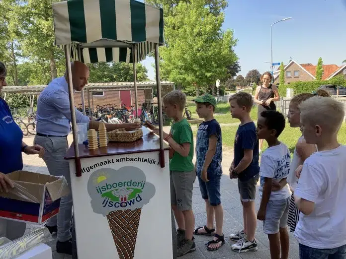 De werkzaamheden aan de hoofdroute door Hattem zijn zo goed als afgerond. Reden voor wethouder Schipper om de leerlingen van De Zaaier te trakteren op een ijsje.