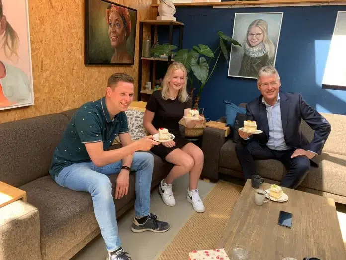 Mirte heeft samen met de minister en haar mentor taart gegeten. Daarna staken ze gedrieën de vlag uit.