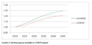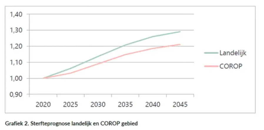 In deze prognose zijn demografische ontwikkelingen in het gebied verwerkt, zoals enerzijds de vergrijzing van de bevolking, de toename van de gemiddelde leeftijd bij overlijden en anderzijds eventuele (stedelijke) uitbreidingen en de huidige en toekomstige leeftijdsopbouw van de bevolking.’
