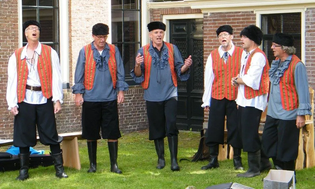 De negen mannen van MNNNZNGVRNGNG uit Beetsterzwaag zingen op zondag 28 april bij theeschenkerij Oldeniel.