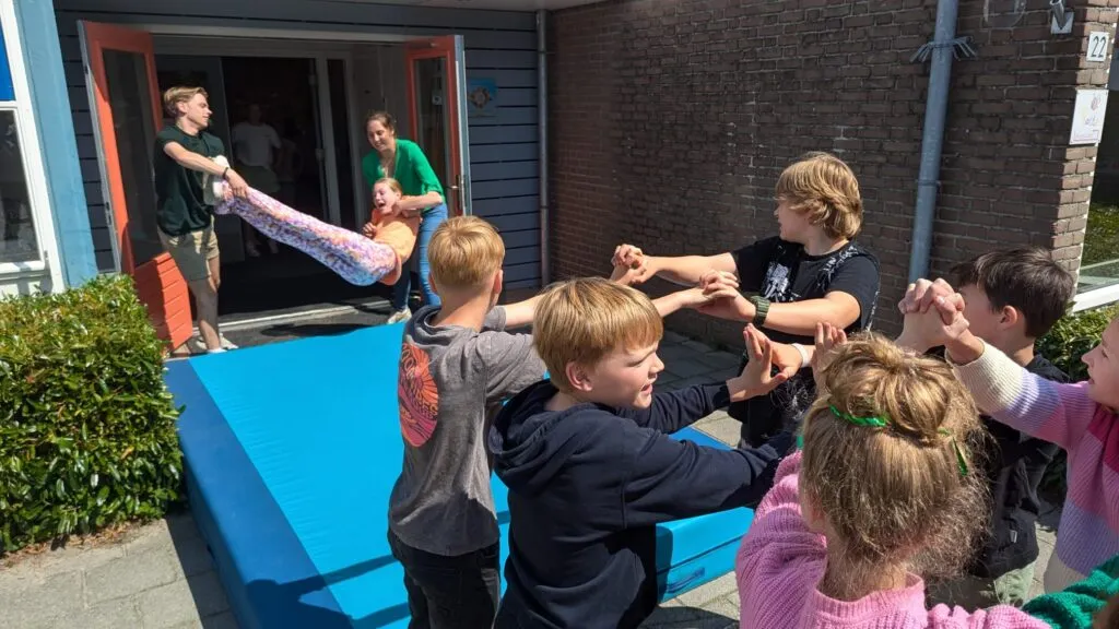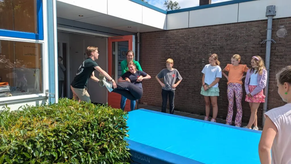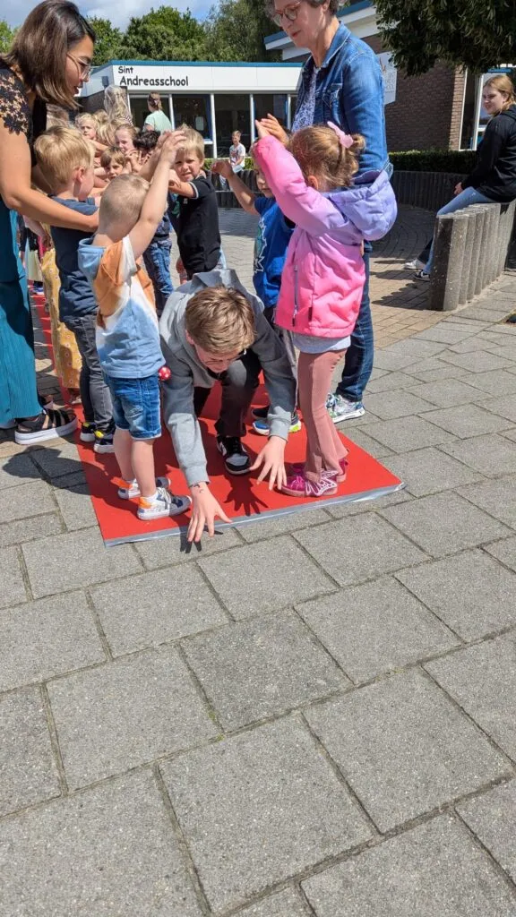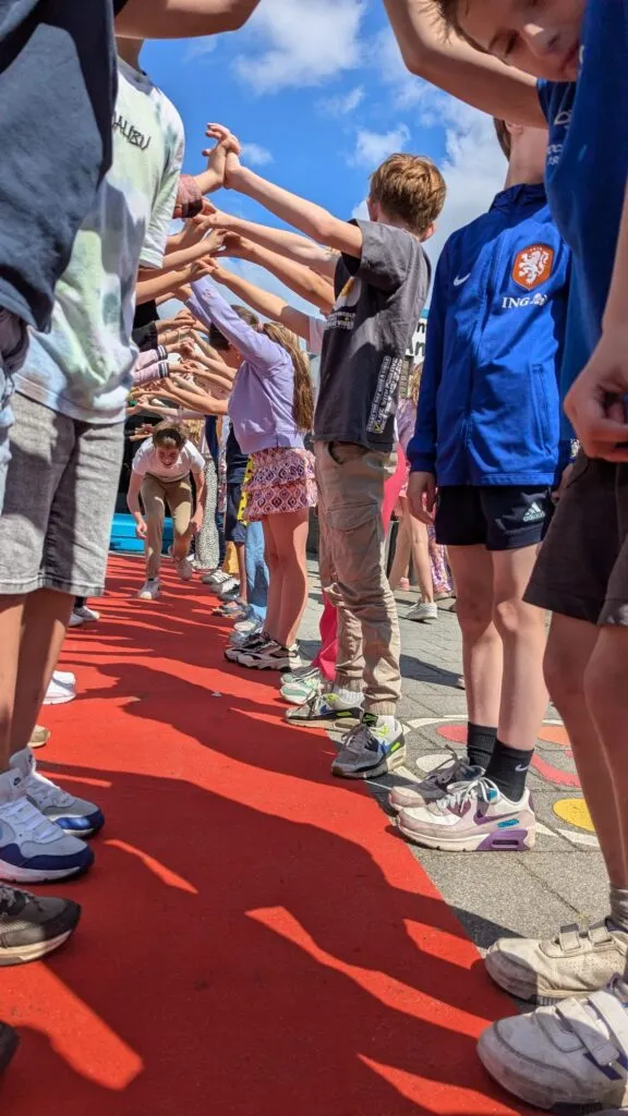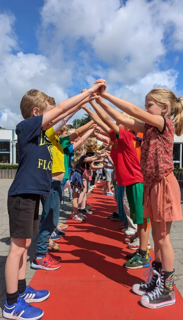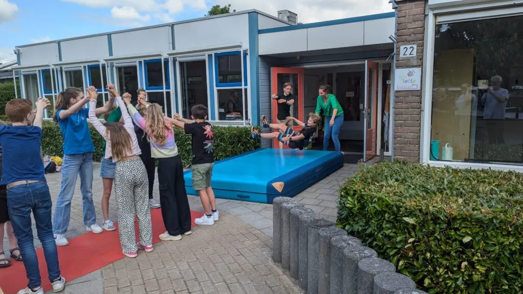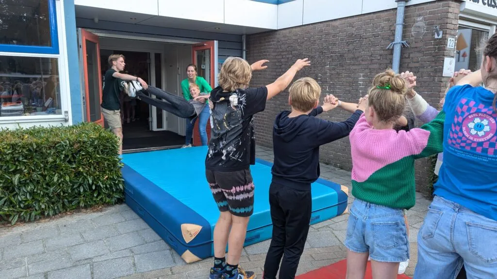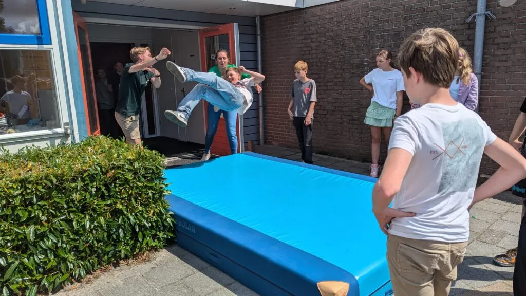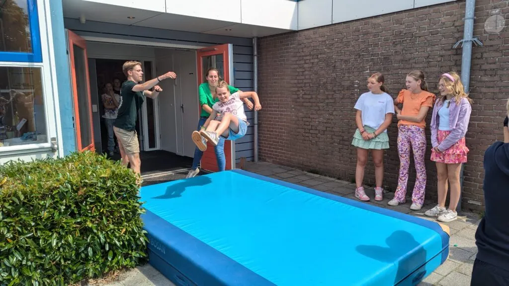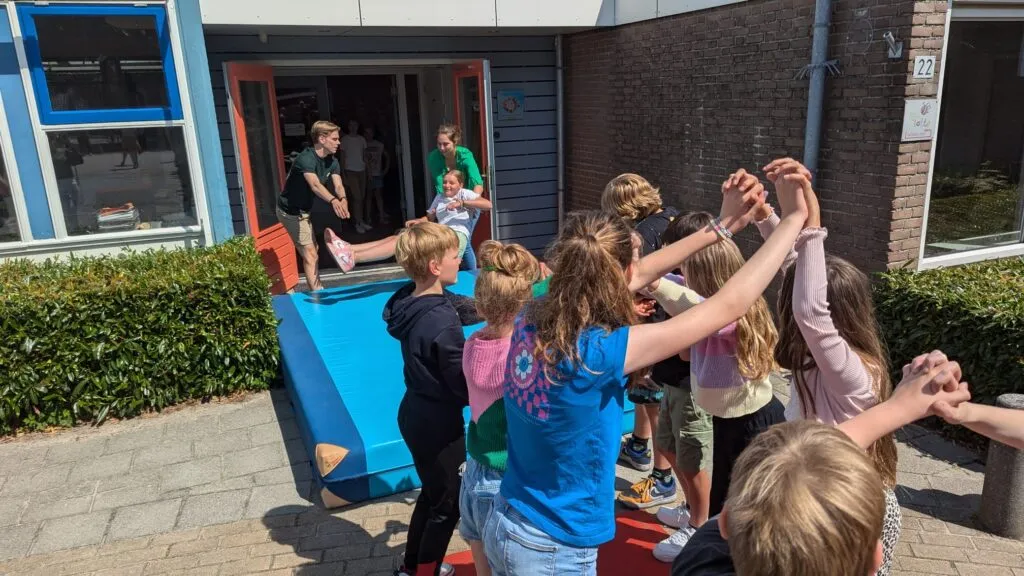 En dan is het tijd voor het vertrek. De twee sterkste leerkrachten staan klaar om de achtstegroepers één voor één de school uit te jonassen. Na een zachte landing op het dikke gymkussen banen de kinderen zich een weg door de erehaag die de andere leerlingen voor ze maken. Dat betekent steeds dieper bukken, want de kinderen van de laagste groepen staan aan het eind van de rij.
