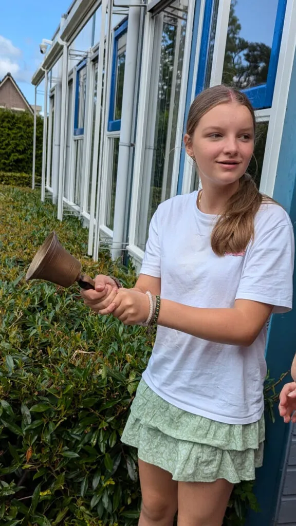 Charlotte mag voor de aller-aller-allerlaatste keer de schoolbel luiden. Het is tijd om naar binnen te gaan voor de slotceremonie. Nog snel snaaien de kinderen wat lekkers van de feestelijke high-teatafel die ze samen hebben klaargemaakt. De juf spreekt de kinderen nog één keer toe: ‘Jullie waren een levendige, maar ook een gezellige groep. En wat me ook opviel is dat jullie goed voor elkaar opkomen. Als er bijvoorbeeld iemand water haalde, deed ie dat meteen voor de rest van de groep.’