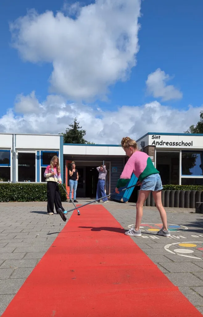 En dan is het tijd voor het vertrek. De twee sterkste leerkrachten staan klaar om de achtstegroepers één voor één de school uit te jonassen. Na een zachte landing op het dikke gymkussen banen de kinderen zich een weg door de erehaag die de andere leerlingen voor ze maken. Dat betekent steeds dieper bukken, want de kinderen van de laagste groepen staan aan het eind van de rij.