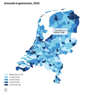 In 2023 waren 540 duizend mensen in Nederland arm. Dat komt neer op 3,1 procent van de bevolking (Hattem: 1,4 procent) In vergelijking met 2018 zijn in 2023 relatief minder bijstandsontvangers en relatief meer werkenden arm. Zij komen doorgaans meer inkomen tekort dan arme bijstandsontvangers, aldus een nieuwe meetmethode die 17 oktober werd gepresenteerd. Het gaat niet meer alleen om het inkomen. Blijft er na het betalen van de vaste lasten te weinig geld over voor andere basisbehoeften, dan is een huishouden arm.