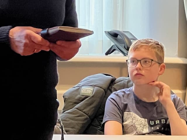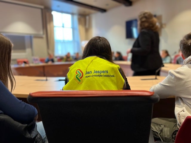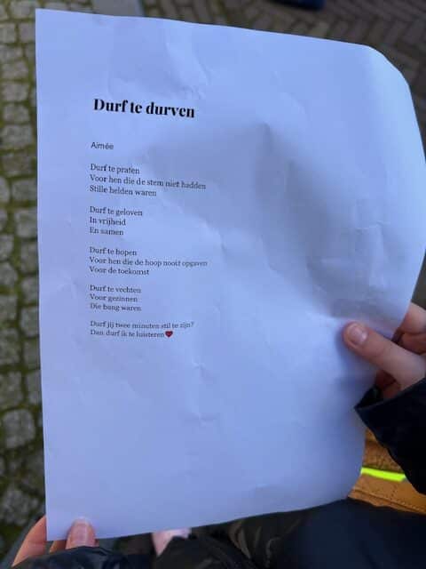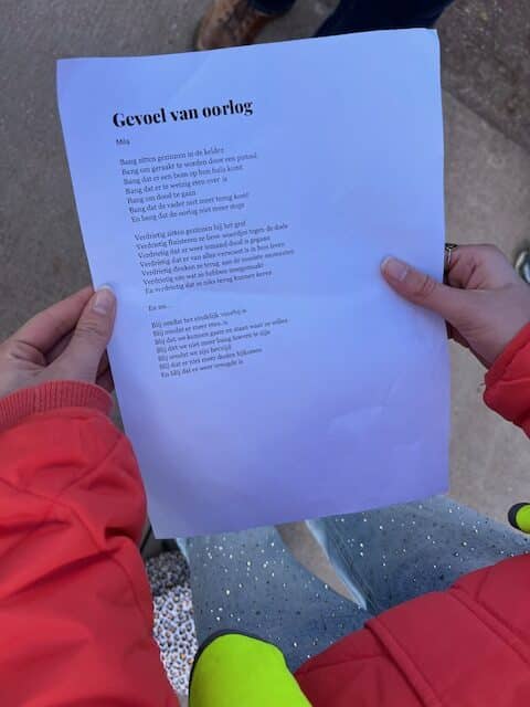 Albert ten Cate vertelde vervolgens indrukwekkende verhalen. Hij begon met de woorden: ‘Vieren we feest? Ik heb mijn twijfels. Wat er op dit moment in de wereld gebeurt… Ik heb de oorlog niet meegemaakt. Toen ik zo oud was als jullie is de Verenigde Naties opgericht. Er zou nooit meer oorlog komen, werd beloofd. Wat er nu in Oekraïne en Gaza gebeurt… Het is niet uitgekomen.’