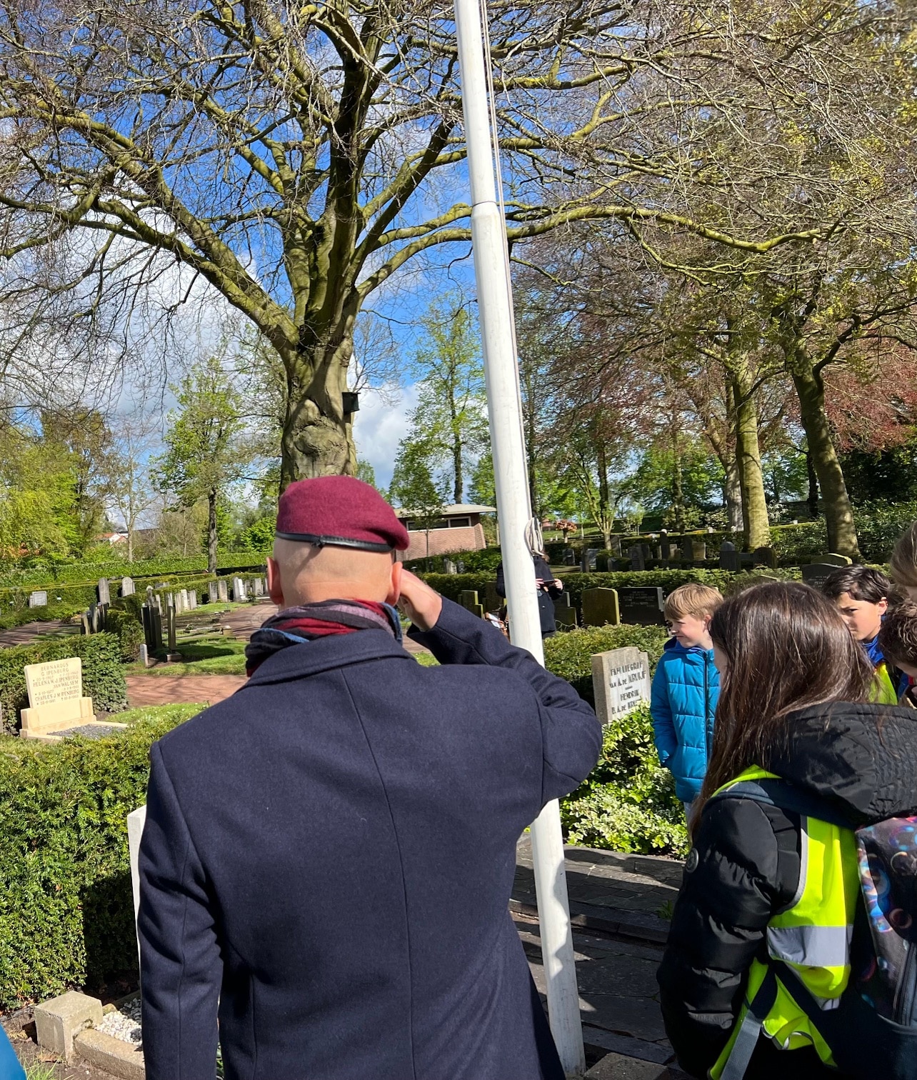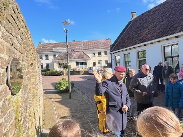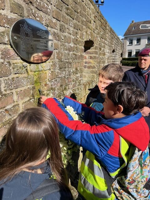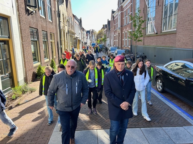 Op 18 april zaten in het stadhuis niet alleen de kinderen, maar ook leden van het 4 en 5 comité Hattem. Ze stelden zich aan de kinderen voor. Bert Wijnhoud is veteraan. Hij is vier keer naar Afghanistan uitgezonden geweest. Vandaag was hij ceremoniemeester vanaf het moment dat iedereen naar buiten ging, op weg naar de gedenkstenen, de synagoge, de ‘plek van bevrijding’ achter de Dijkpoort, en op de begraafplaats bij het graf van Austin.