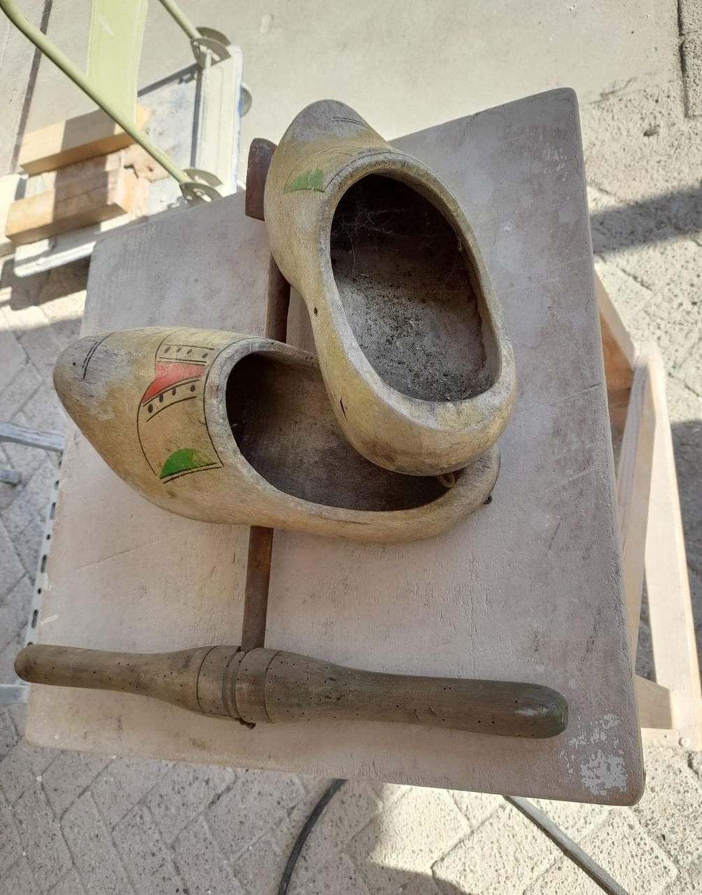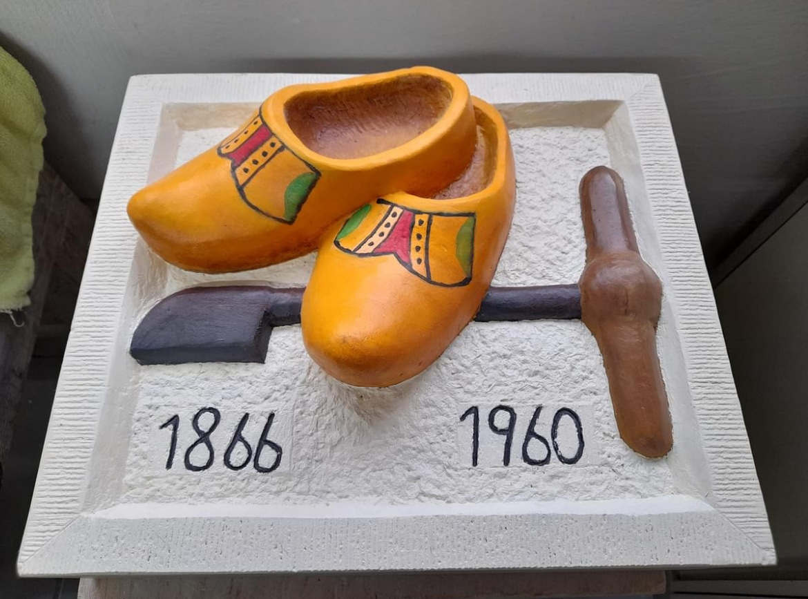 Aan de Noordwal was Veldkamp’s klompenmakerij. Teo Visser van het gilde heeft een gevelsteen met klompen ontworpen, uitgehakt en beschilderd. Daarbij moet je de officiële kleuren gebruiken, want elke klompenmakerij had zijn eigen kleuren.’