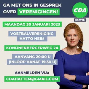 Inge komt op maandagavond 30 januari 2023 naar Hattem. Verenigingen en vrijwilligers uit Hattem zijn welkom vanaf 19.30 uur bij Voetbalvereniging Hatto Heim, Konijnenbergerweg 2a. Om 20.00 uur start de bijeenkomst met Inge van Dijk. Aanmelden kan via cdahattem@gmail.com. Via dit mailadres kunnen belangstellenden ook vragen of opmerkingen achterlaten.