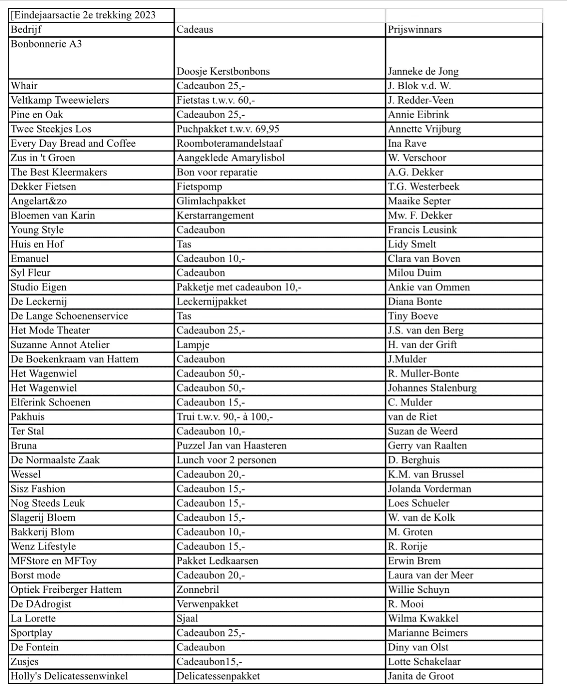 De leden van de ondernemersvereniging pakken dit jaar groots uit met een eindejaarsactie waarbij prachtige prijzen te winnen zijn. Alle cadeaus zijn beschikbaar gesteld door de winkeliers van Hattem.