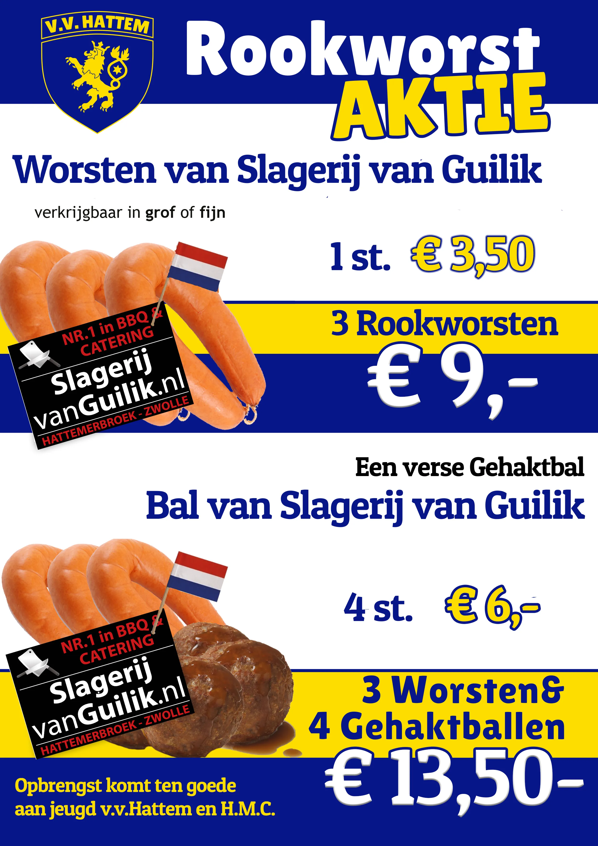 De opbrengst van de verkoop van de rookworsten en gehaktballen van slagerij van Guilik is voor de bloeiende jeugdafdeling van de vv Hattem en HMC. Betaling kan zaterdag aan de deur alleen contant.