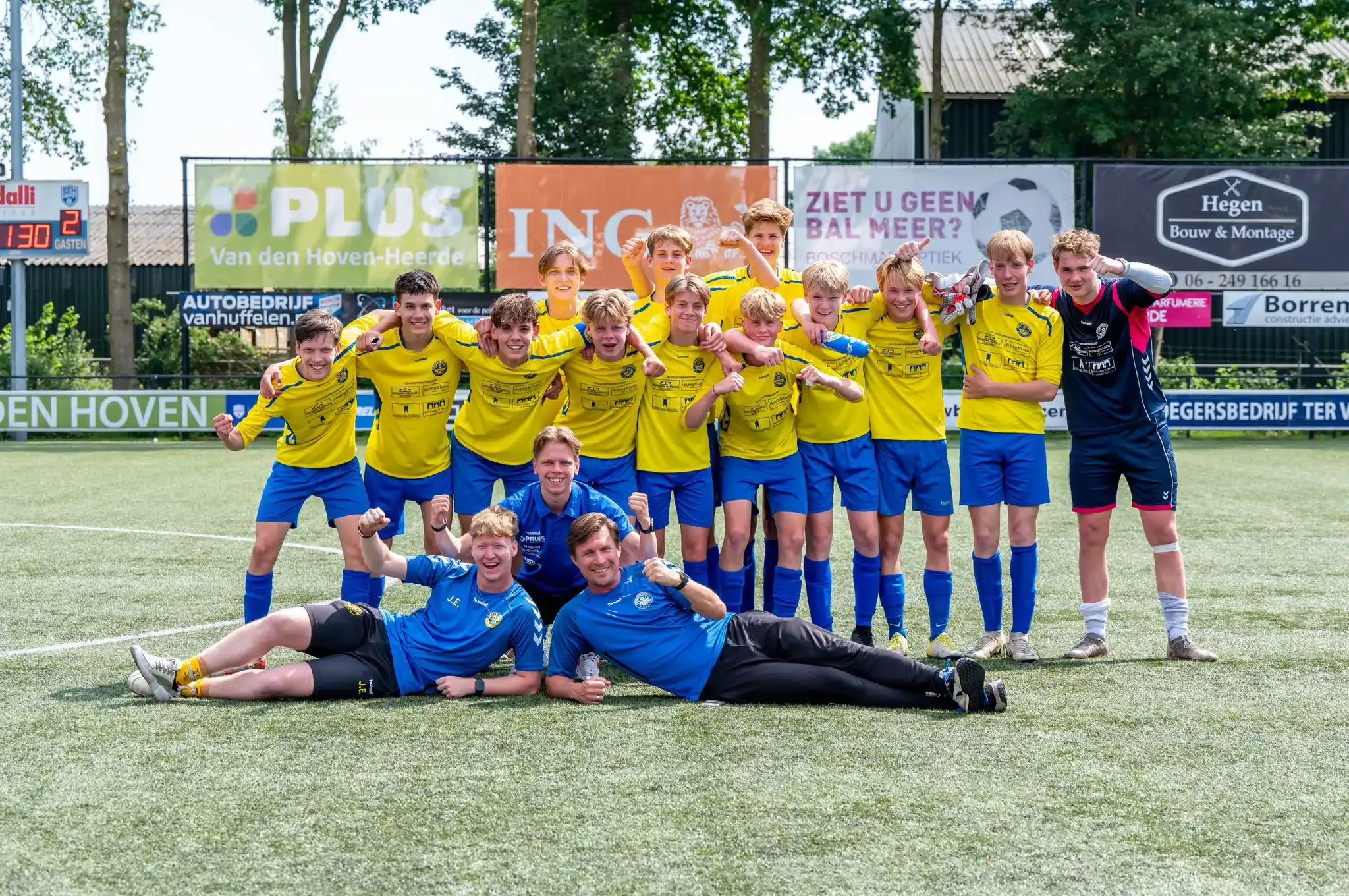 Over de tweede helft kunnen we kort zijn: die was niet om aan te zien. SEH ging over tot een handbalverdediging rond de eigen zestien meter. Daar brak het team nog een keer door heen. Sill speelde de bal goed in op Keanu die vervolgens beheerst scoorde: 0-2. De enige kans van de hele wedstrijd die SEH kreeg werd door Ezra vakkundig verijdeld. Na het laatste fluitsignaal grote blijdschap bij zowel de spelers als bij het talrijke publiek dat uit Hattem was meegekomen. Het team mag zich officieus kampioen van de eerste klasse noemen.