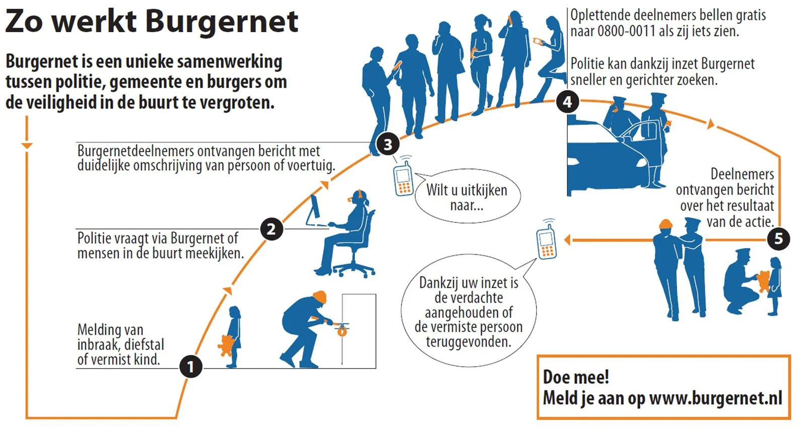 Bij Burgernet werk je samen met de politie aan veiligheid in jouw buurt. Elke deelnemer maakt de buurt een stukje veiliger. Want hoe meer mensen meedoen, hoe sneller een persoon of voertuig wordt gevonden.