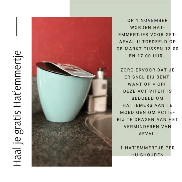 Op 1 november worden Hat-emmertjes voor GFT-afval uitgedeeld op de Markt tussen 13.00 en 17.00 uur. Wees er snel bij, want op = op! Deze activiteit is bedoeld om Hattemers aan te moedigen om actief bij te dragen aan het verminderen van afval.