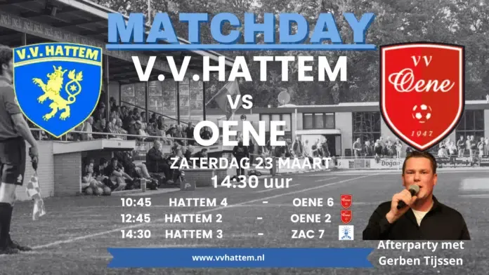 Zaterdag 23 maart staat in het teken van de ontmoeting van de voetbalclubs Hattem – Oene. v.v. Oene komt zaterdag met drie teams naar Hattem om tegen respectievelijk Hattem 4, Hattem 2 en Hattem 1 te spelen.