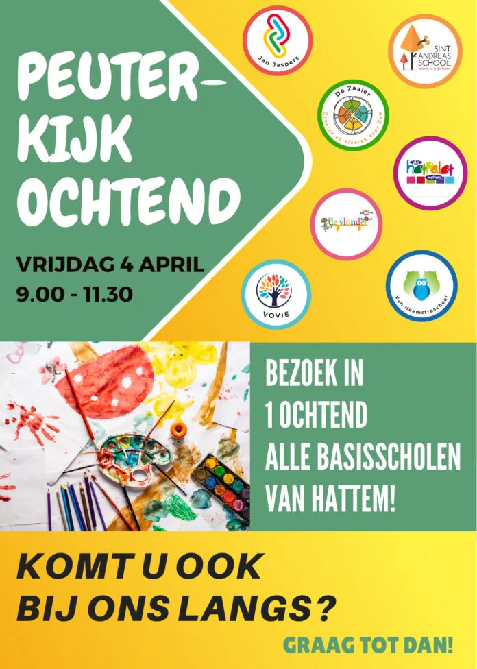 Peuter- en kijkdag Door de nieuwsredactie - 21 maart 2025 Alle basisscholen hebben op vrijdag 4 april een peuter- en kijkdag. De scholen zijn te bezoeken tussen 9.00 – 11.30 uur.