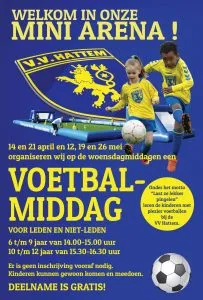 De volgens Open Voetbalmiddagen zijn op 21 april, 12, 19 en 26 mei, waarbij de deelnemers nog vaker verrast zullen worden door bekende gasttrainers. Onder het motto “Laat ze lekker pingelen” organiseert vv Hattem deze voetbalactiviteiten voor de jeugd van 6 tot en met 12 jaar. Aan deze Open Voetbalmiddagen kan iedereen meedoen, je hoeft niet op voetbal te zitten of lid te zijn van vv Hattem.