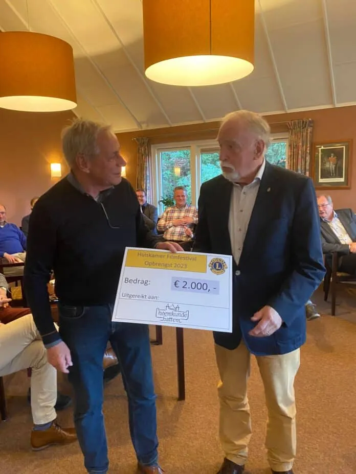 HATTEM – Heemkunde Hattem heeft afgelopen week een cheque van 2000 euro in ontvangst mogen nemen van Lions Club Hattem. Dit bedrag is het resultaat van het Huiskamerfilmfestival dat de serviceclub in februari voor de zestiende keer organiseerde.