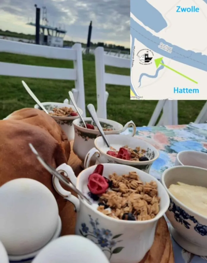 De theeschenkerij bevindt zich aan de Hattemse kant van de IJssel bij de fiets- en voetveerpont ’t Kleine Veer tussen Zwolle Zuid en Hattem.