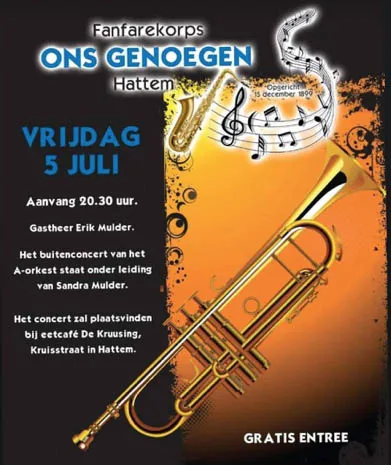 Op vrijdag 5 juli geeft het A-orkest van het Fanfarekorps Ons Genoegen een buitenconcert. In tegenstelling tot voorgaande jaren zal het concert dit keer niet plaatsvinden op de Markt, maar bij en in samenwerking met de beheerders van ‘Eethuisje de Kruussing’.