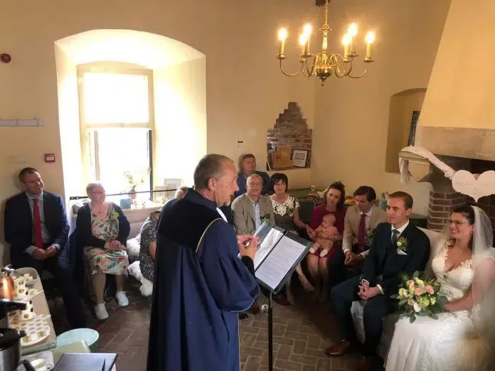 De mooie bruid in het wit met kant, hij in statig donkergroen pak. Zij, door haar vader de trap af begeleid, waar de bruidegom naar zijn bruid uitkeek. Buitengewoon Ambtenaar Burgerlijke Stand Gerrit Holstege voltrok het huwelijk met een zelfgeschreven gedicht, waarna het glas met bubbels werd geheven en het gezelschap de poort kon bekijken. Het jawoord in de poort vormde zo een onvergetelijk moment.