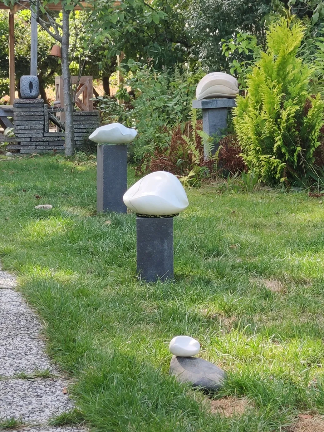 De beeldentuin is gevarieerd ingericht en beplant met verschillende heesters, bloemen, kruiden + fruitboompjes. Achterin de tuin is haar beeldhouwplek + worden workshops speksteen gegeven, bij minder weer is dit binnen.