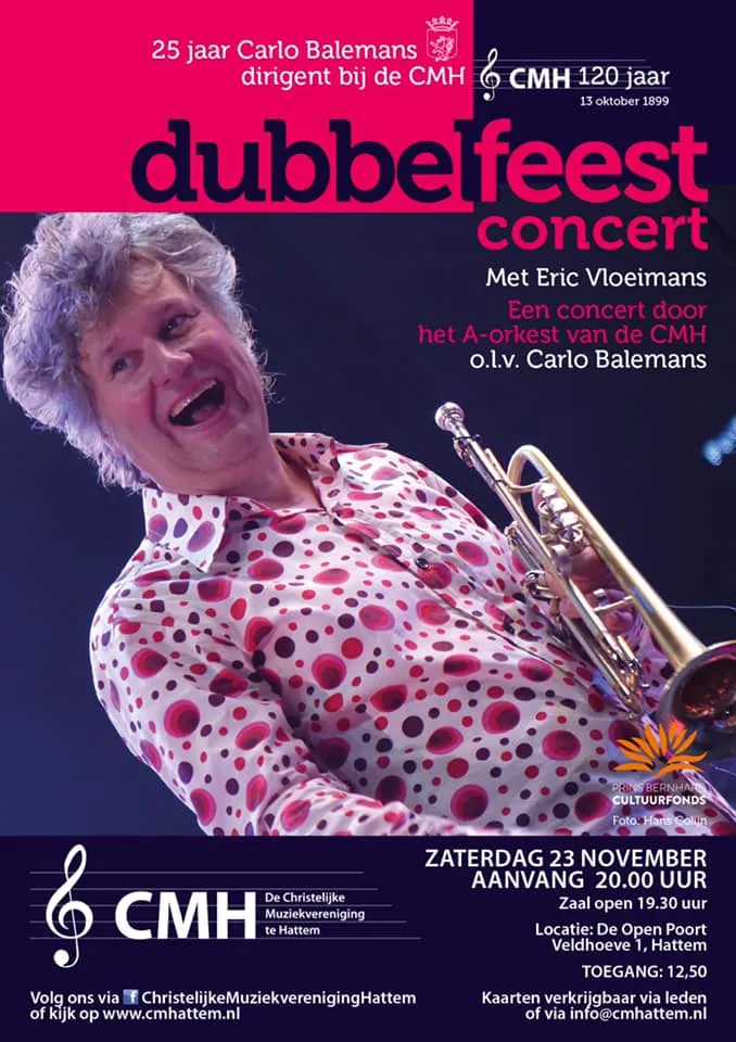 Om het dubbele jubileum extra feestelijk te maken, heeft de CMH aan Eric Vloeimans gevraagd om samen een concert te geven. Eric Vloeimans is een bekende Nederlandse jazztrompettist, maar heeft een keur aan stijlen in huis. Van barok tot pop en van klassiek tot jazz. De manier waarop Eric trompet speelt is niet overheersend, maar warm en melodieus.