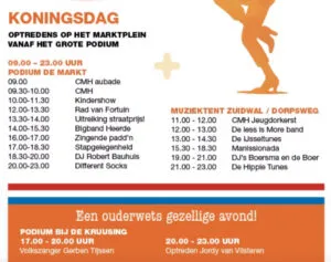Koningsnacht gaat vooraf aan Koningsdag. De laatste begint om 09.00 uur met de aubade op de Markt, zoals altijd bijgestaan door de scouting. De kleedjesmarkt vindt dit jaar plaats in de Kerkstraat.